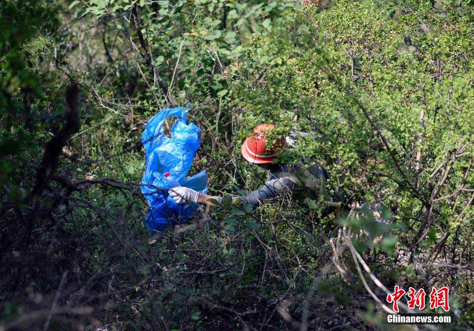Litter pickers risk their lives to collect the rubbish thrown over the cliff edge by tourists.(Photo/Chinanews.com)