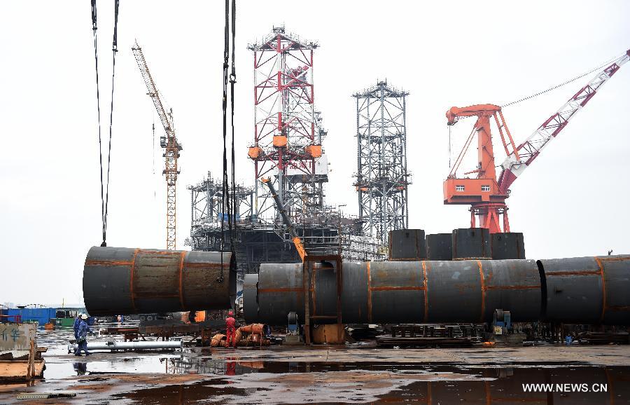 Workers assemble the drilling rig HYSY 982 at China Oilfield Services Limited in Dalian, northeast China's Liaoning Province, July 31, 2015. HYSY 982 is a sixth generation deep-water semi-submersible drilling rig equipped with DP 3 dynamic positioning system, designed for a maximum operating depth of 5,000 feet (1,524 meters) and a maximum drilling depth of 30,000 feet (9,144 meters). It is expected to be delivered in August 2016. (Xinhua/Yang Qing)