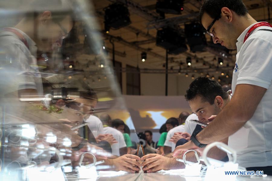 Visitors view Sony's smartphones at Sony's stand of the 55th IFA consumer electronics fair in Berlin, Germany, on Sept. 4, 2015. As the 55th IFA consumer electronics fair, Europe's largest consumer electronics and home appliances fair kicked off on Friday in Berlin, China Brand Show also held its first opening ceremony at IFA. (Xinhua/Zhang Fan)