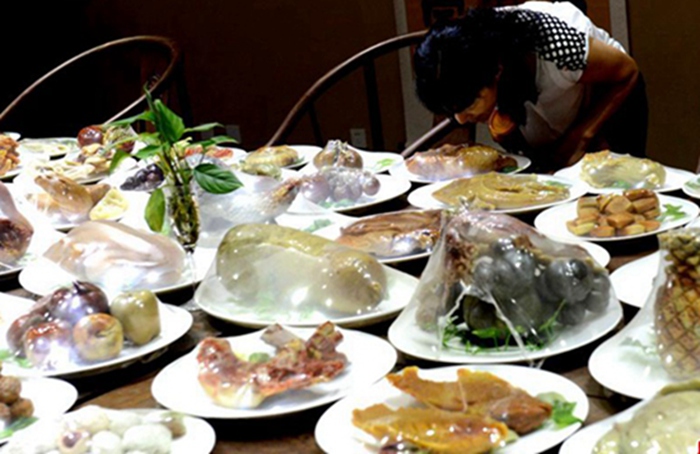 A life-like stone banquet composed of 143 popular Chinese dishes is on display in an art museum in Fuzhou, Fujian province, southeast China on Sep 24, 2015. The banquet is the work of stonemason Sun Zhaoyong, who has carved rocks such as petrified wood, agate, jade and malachite to make the amazing feast for nearly 20 years.(CNS/Liu Kegeng)