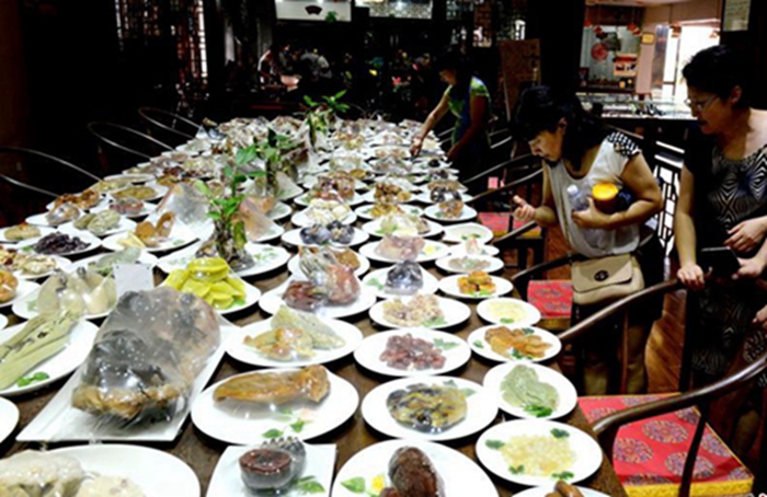 A life-like stone banquet composed of 143 popular Chinese dishes is on display in an art museum in Fuzhou, Fujian province, southeast China on Sep 24, 2015. The banquet is the work of stonemason Sun Zhaoyong, who has carved rocks such as petrified wood, agate, jade and malachite to make the amazing feast for nearly 20 years.(CNS/Liu Kegeng)