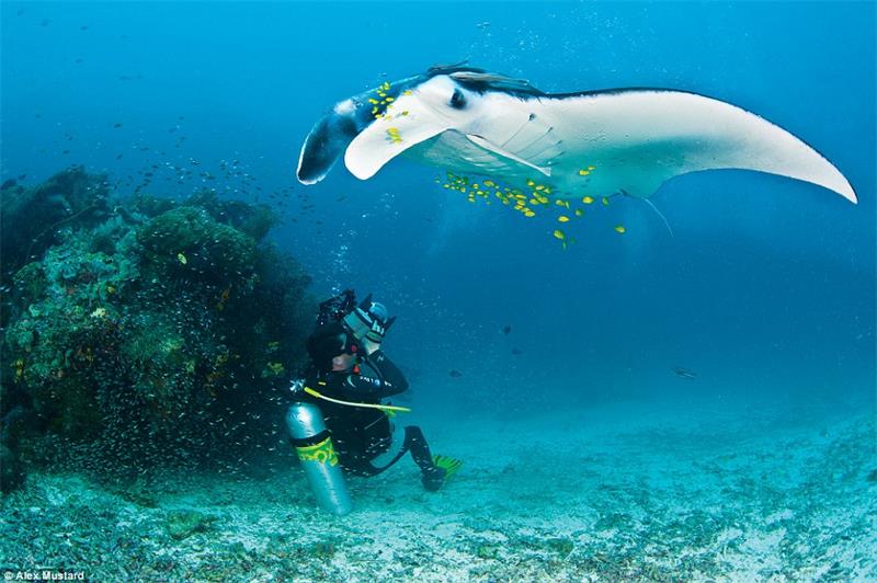 A manta ray (Manta birostris) hovers above a cleaning station on a coral reef, while a diver photographs it from below in West Papua, Indonesia