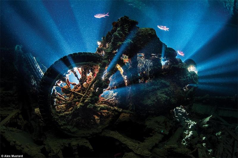 A backlit photo of a British World War II BSA M20 motorbike inside Hold 2 (port side, upper level) of the wreck of the Thistlegorm, with Red Sea soldierfish in the Red Sea, Sinai, Egypt