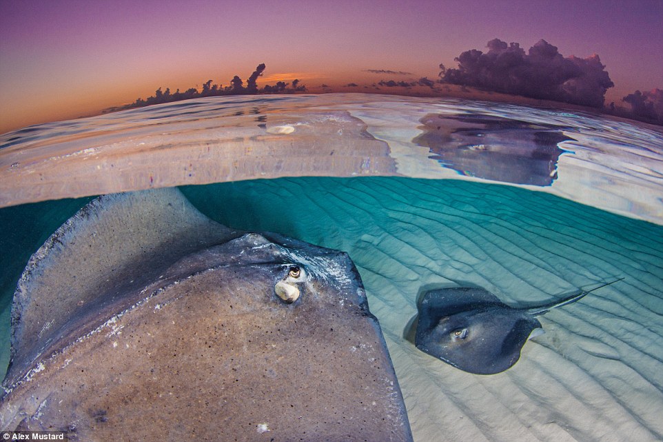 One of the most striking moments captured is a split level image showing a dusky pink sunrise above the surface and two stingrays on the golden ocean bed below.