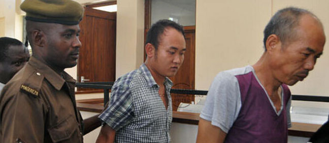 Two Chinese nationals are arrested and sentenced for illegal hunting and trading in ivory at a local court in Tanzania on March 20, 2016. [Photo: Weibo]