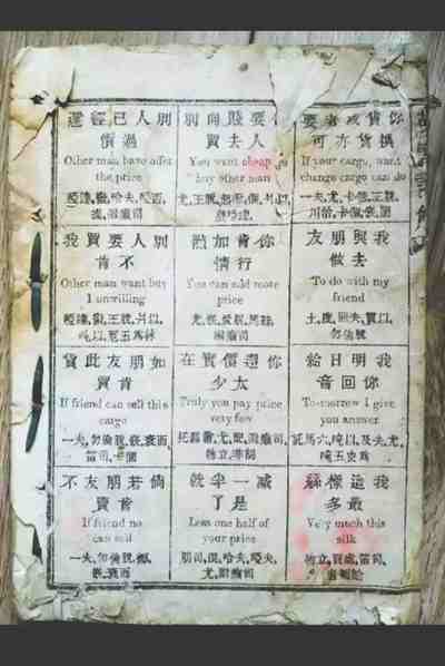 As the pictures show, each page of the book is divided into 12 grids, and each grid contains three sentences: a Chinese sentence on top, an English sentence in the middle and a pinyin transliteration at the bottom. Modern historians confirm that it was common during that period for Chinese people to learn English through pinyin. However, pinyin-guided English lessons mostly appear in non-standard textbooks, according to Professor Lei Hanqing, a linguist at Sichuan University.