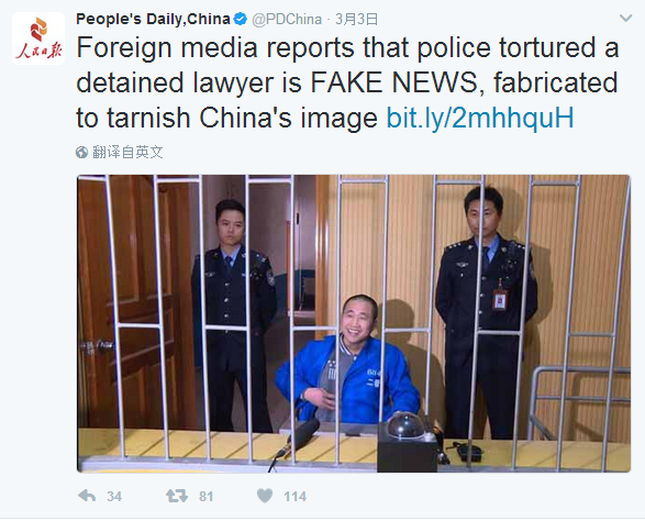 “Foreign media reports that police tortured a detained lawyer is FAKE NEWS, fabricated to tarnish China’s image,” People’s Daily tweeted on March 3. The wording of the tweet, written to mimic the style of U.S. President Donald Trump, struck a nerve with some readers.