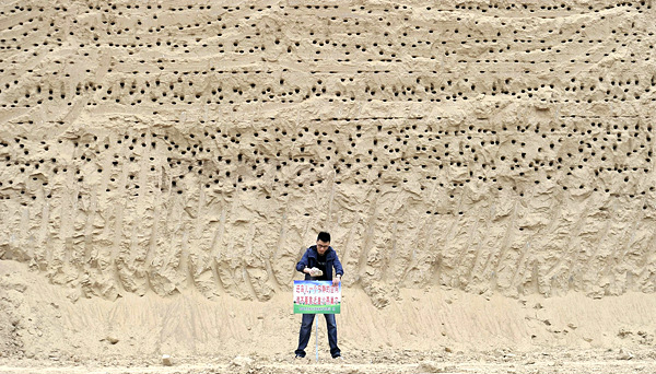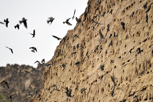 Flocks of sand martins have built nests on a 30-meter-tall cliff that is part of the construction site belonging to Shaanxi Provincial Natural Gas Co., Ltd. The site is located in Xi’an, capital city of northwest China’s Shaanxi province. The cliff formed after a small hill was excavated in the process of construction.
