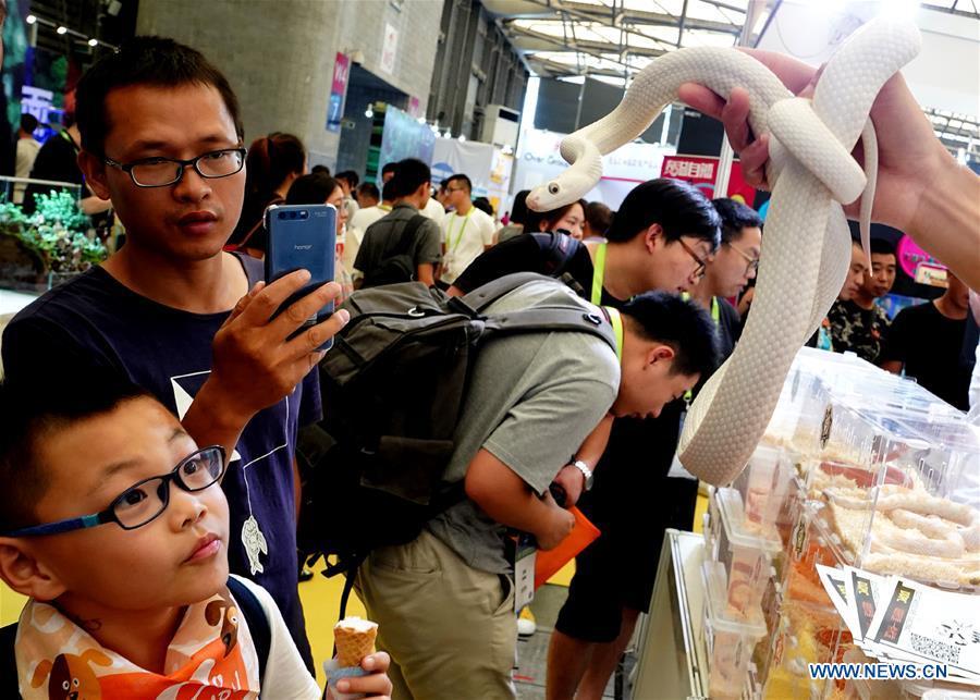 A snake (elaphe obsoleta) is seen at the Pet Fair Asia 2017 in Shanghai, east China's Shanghai Municipality, Aug. 24, 2017. The Pet Fair Asia 2017 kicked off at Shanghai New International Expo Center Thursday, with 950 exhibitors from around the world participating. (Xinhua/Chen Fei)