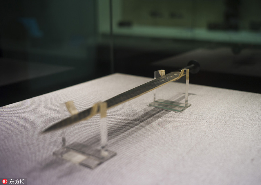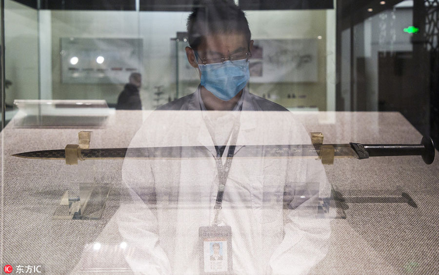 Jiang Xudong, deputy director of the Culture and History Center of the Hubei Provincial Museum, carefully studies an ancient sword that was once used by King Goujian of the State of Yue during the Spring and Autumn Period (770 B.C.- 476 B.C.). Jiang is now leading a group of scientists to explore the history of the ancient sword. Its history was vividly displayed to the public in a popular TV program called “National Treasure,” which was first aired by China Central Television (CCTV) on Dec. 3.