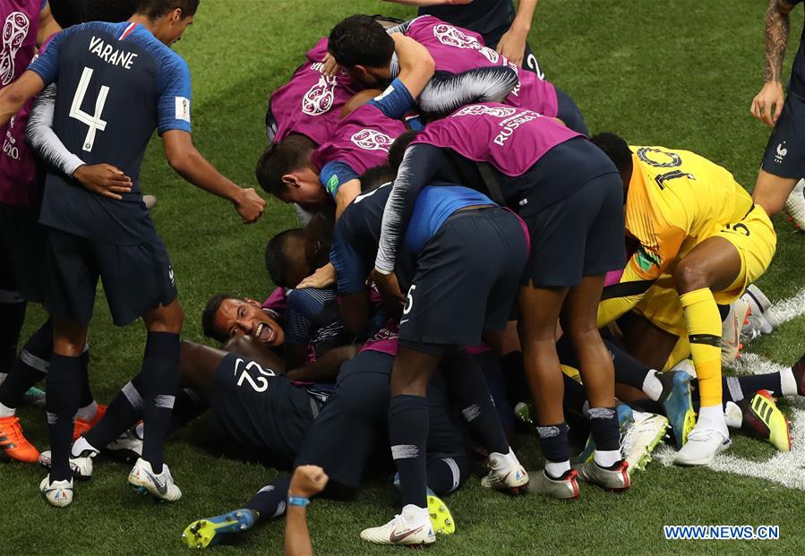 Players of France celebrate Paul Pogba's goal during the 2018 FIFA World Cup final match between France and Croatia in Moscow, Russia, July 15, 2018. (Xinhua/Xu Zijian)
