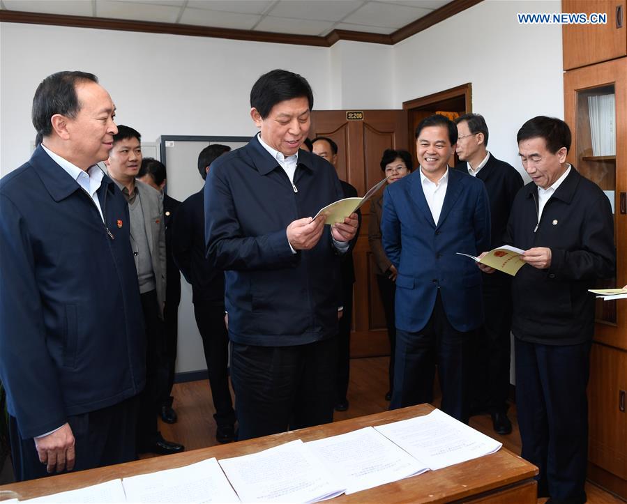 Li Zhanshu, a member of the Standing Committee of the Political Bureau of the Communist Party of China Central Committee and chairman of the National People's Congress Standing Committee, makes a research on local legislation at the Standing Committee of Yunnan Provincial People's Congress in Kunming, southwest China's Yunnan Province, Nov. 28, 2018. Li made a four-day research on how to better make a law on basic medical care and health promotion in Yunnan Province. (Xinhua/Shen Hong)