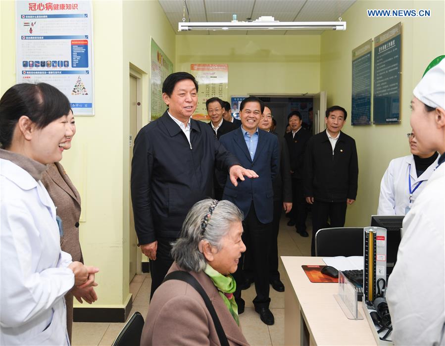 Li Zhanshu, a member of the Standing Committee of the Political Bureau of the Communist Party of China Central Committee and chairman of the National People's Congress Standing Committee, talks with doctors and patients in a healthcare center in Qianwei community of Xishan District of Kunming City, southwest China's Yunnan Province, Nov. 29, 2018. Li made a research on how to better make a law on basic medical care and health promotion during his four-day tour to Yunnan Province. (Xinhua/Shen Hong)