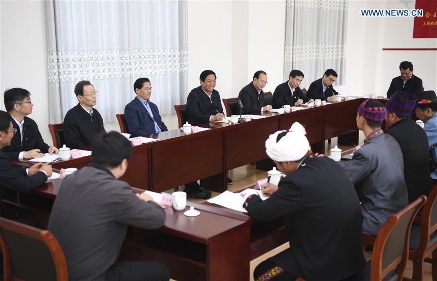 Li Zhanshu, a member of the Standing Committee of the Political Bureau of the Communist Party of China Central Committee and chairman of the National People's Congress Standing Committee, speaks with deputies to people's congresses at various levels and grass-roots cadres on their opinions about the law draft at Huyu Village of Ruili City of Dai-Jingpo Autonomous Prefecture of Dehong, southwest China's Yunnan Province, Nov. 30, 2018. Li made a research on how to better make a law on basic medical care and health promotion during his four-day tour to Yunnan Province. (Xinhua/Shen Hong)