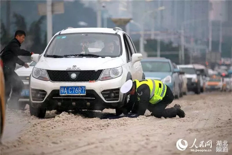 Cao Yong, a traffic policeman in Wuhan in central China’s Hubei province put his clothes under tires to increase traction for the vehicles trapped in snow, winning thumbs-up from pedestrians.