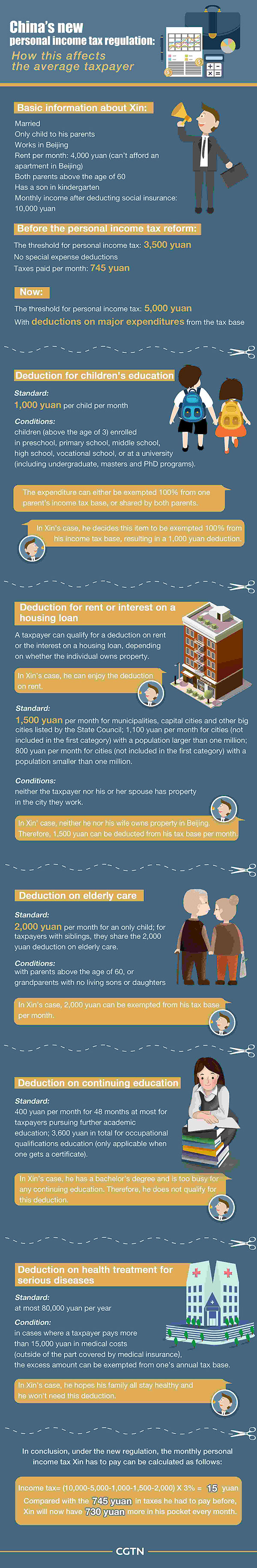 "With all the deductions from the tax base, I will get about 600 yuan more every month in my pocket, which sums up to over 7,000 yuan in a year. That's a substantial increase," said Sun, a Beijing-based white collar.