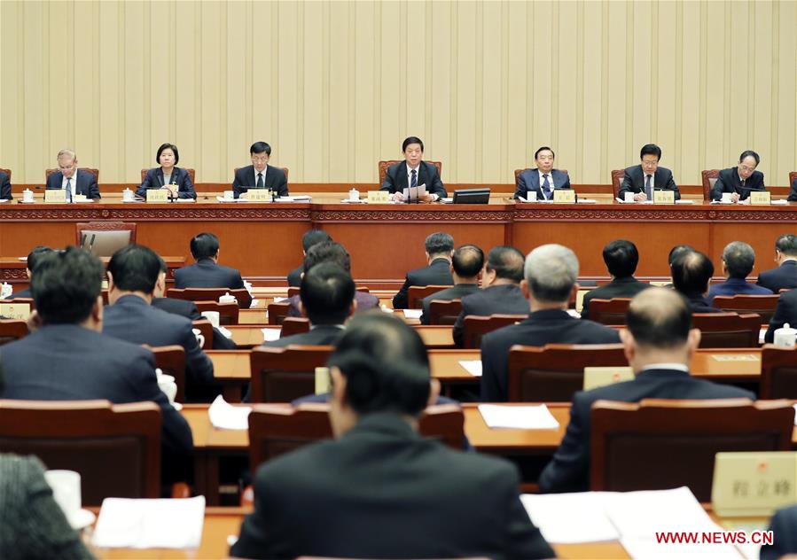 Li Zhanshu (C), chairman of the National People's Congress (NPC) Standing Committee, presides over the closing of the bimonthly session of the 13th NPC Standing Committee in Beijing, capital of China, Feb. 27, 2019. (Xinhua/Liu Weibing)