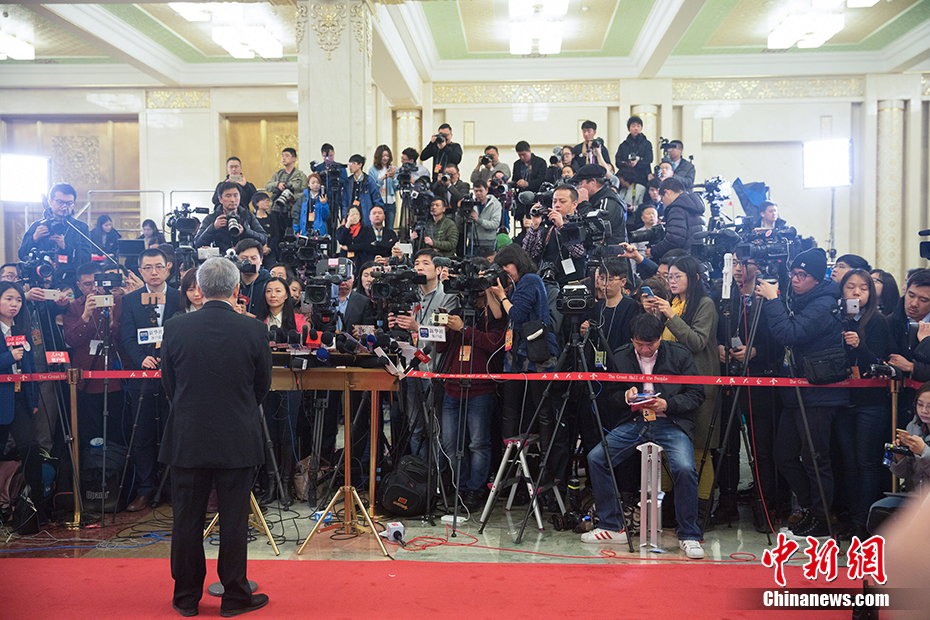 Journalists conduct interview at the Ministers' Corridor of the Two Sessions (Photo/Chinanews.com)