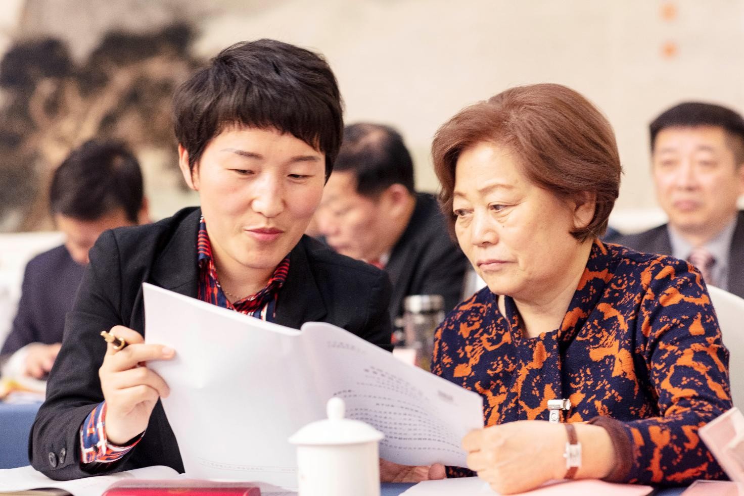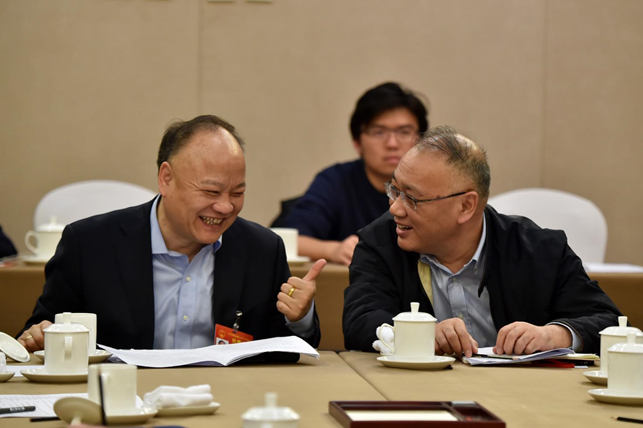Wang Dujuan, chief engineer of China Railway Engineering Equipment Group Co., LTD (CREG) and Wang Xiu (1st from the right), vice chairperson of the federation of literary and art circles in Henan’s provincial capital Luoyang, are discussing on the draft of the foreign investment law. Deputies to the 13th National People's Congress (NPC) from central China’s Henan province held a plenary meeting on March 10, 2019 to review the draft. (Photo by Shi Jiamin from People’s Daily)