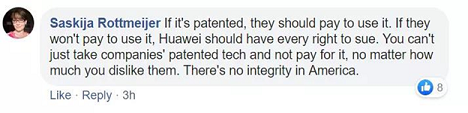 One Facebook user said: “If it’s patented, they should pay to use it. If they won’t pay to use it, Huawei should have every right to sue. You can’t just take companies’ patented tech and not pay for it, no matter how much you dislike them. There’s no integrity in America.”