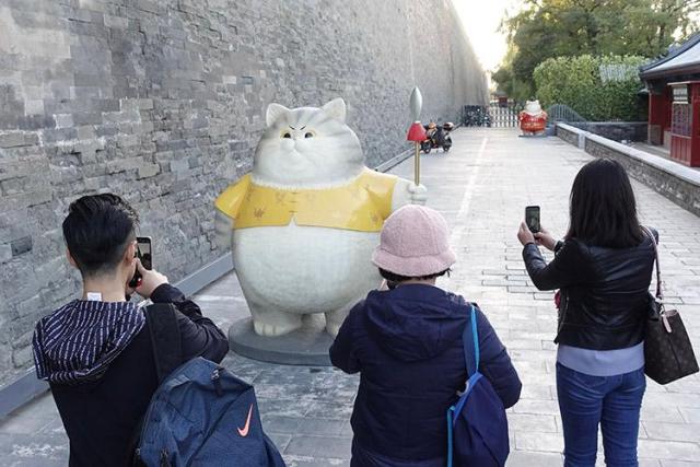 Giant statues of cats, dressed as imperial guards of the Ming and Qing Dynasties, sit near the gate of divine prowess at Beijing’s Palace Museum. Large groups of visitors take pictures with these adorable “royal cats” on Oct. 28, 2019. (The Beijing News/Li Kaixiang)