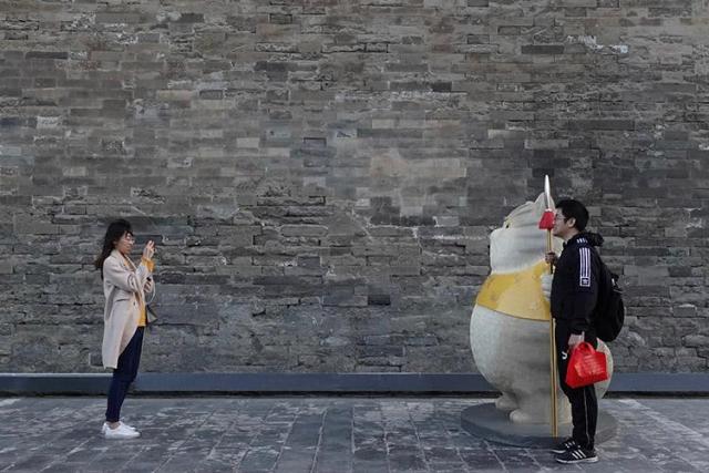 Giant statues of cats, dressed as imperial guards of the Ming and Qing Dynasties, sit near the gate of divine prowess at Beijing’s Palace Museum. Large groups of visitors take pictures with these adorable “royal cats” on Oct. 28, 2019. (The Beijing News/Li Kaixiang)