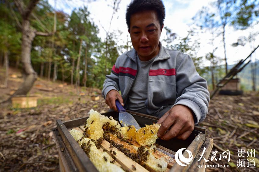 Zhang Xiuheng inspects a beehive at a bee cultivation cooperative in Danzhai county, Qiandongnan Miao and Dong Autonomous Prefecture, southwest China's Guizhou province, Nov. 7, 2019. Zhang has made money through cultivating honey bees since 2016. Now, he is head of a bee farming cooperative that earns about 300,000 yuan a year. (Photo from People's Daily Online)