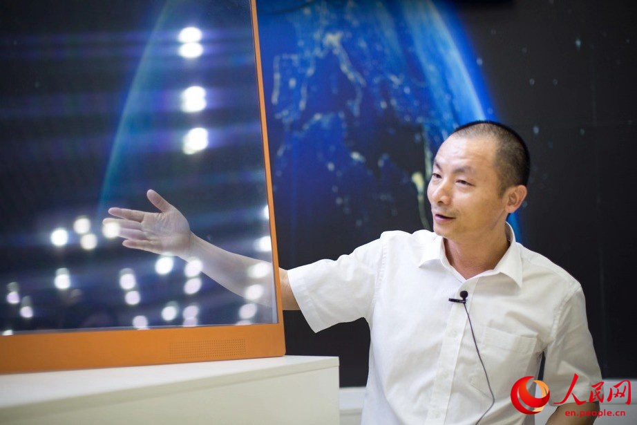 Wang Chengbing, Deputy General Manager of Beihai Huike Electronics Co., Ltd., introduces a see-through TV during an interview. (Photo/Tanja Herko)