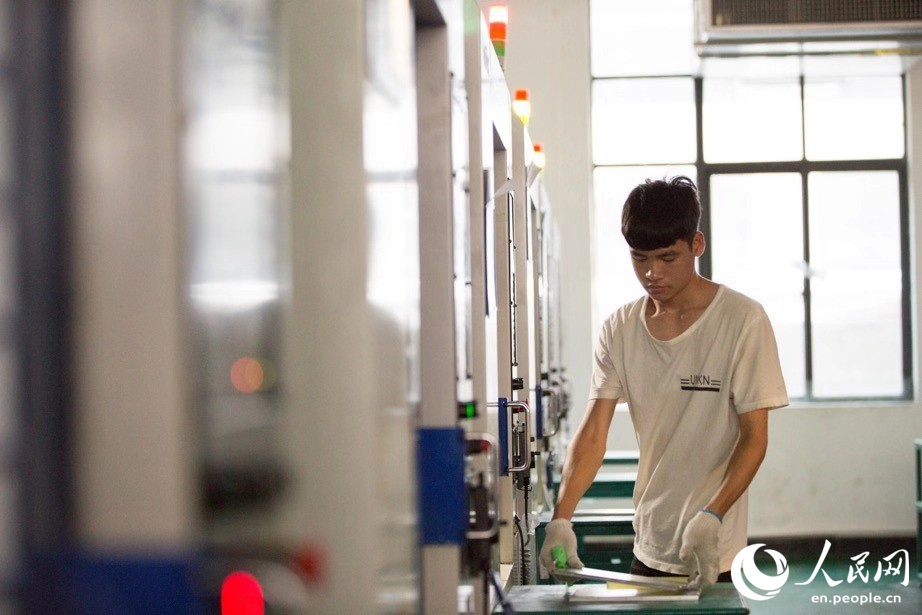 A worker works at a production workshop at Beihai Huike Electronics Co., Ltd. (Photo/Tanja Herko)