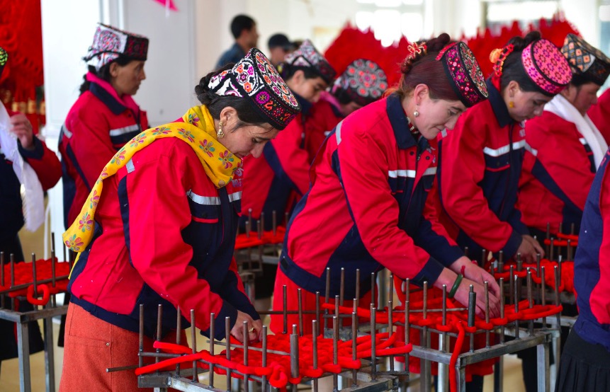 Women make Chinese knots at Tati Kuli, a settlement in Tashikurgan Tajik autonomous county, Xinjiang. [Photo by LIU YUHANG/FOR CHINA DAILY]