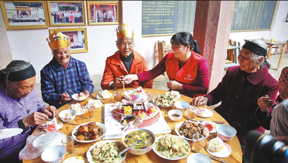 They shared the cake and the moment of memory along with more than 60 other village seniors at a free lunch banquet on Dec 16. The lunches, in what's been dubbed the "filial love canteen", have been offered to all residents over age 80 three times a month since May 2018. They provide an opportunity for them to talk and for village officials to brief them on the latest government policies.