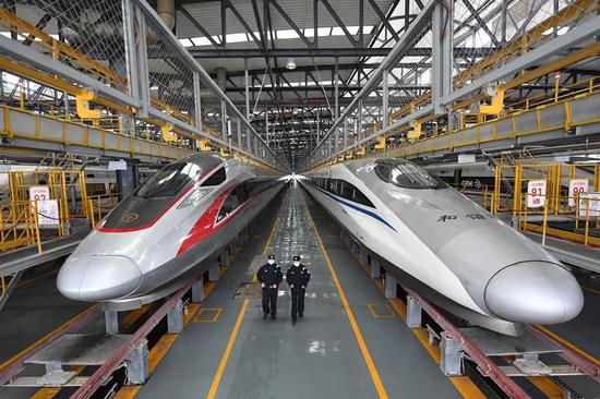 Photo taken on April 6 shows technicians maintaining high-speed trains. (Photo/Hubei Daily)