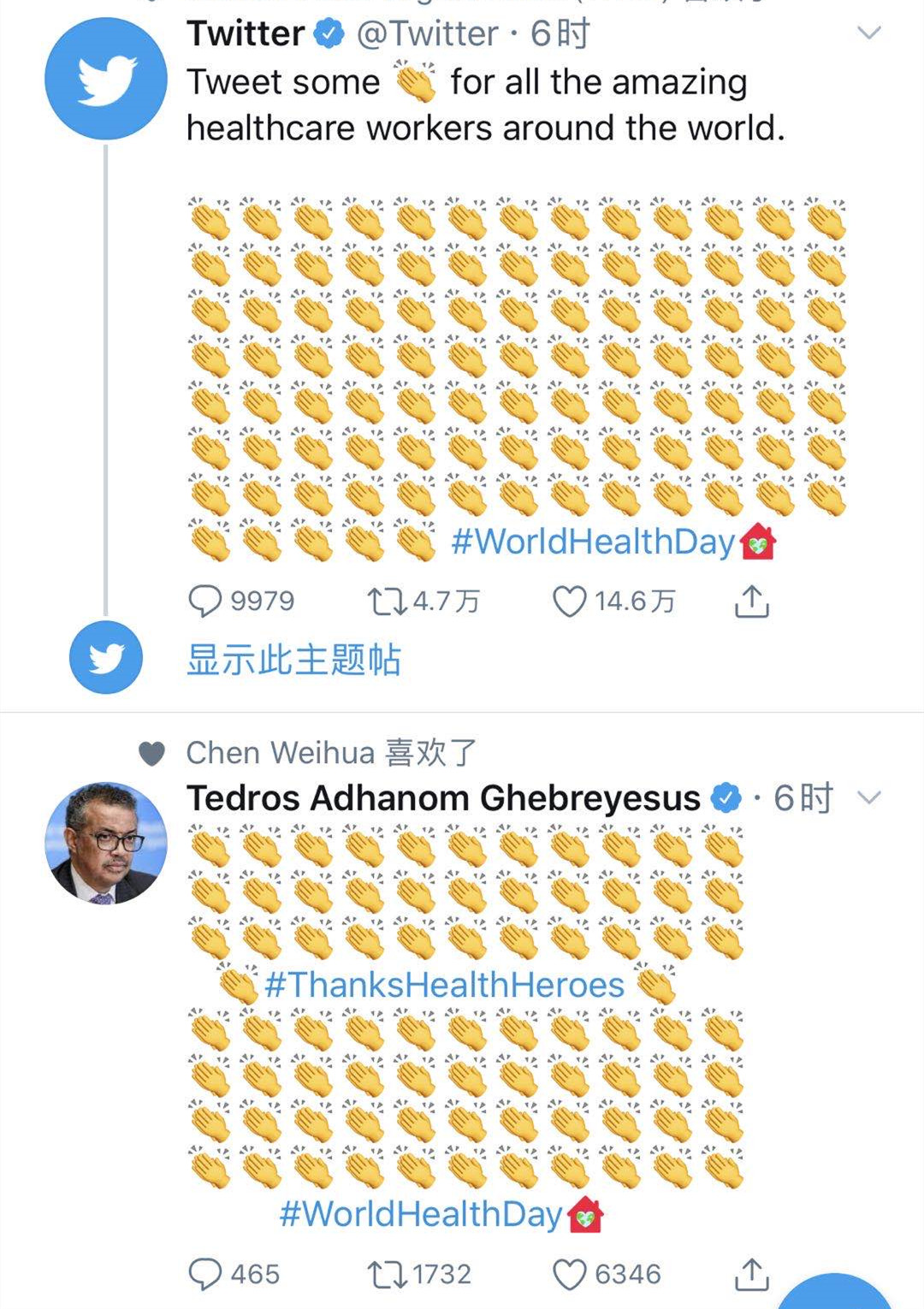 In celebration of World Health Day that falls on April 7, Tedros Adhanom Ghebreyesus, Director-General of the World Health Organization (WHO), tweeted a picture with dozens of applause emojis to thank the heroes working in the health care sector during the epidemic.