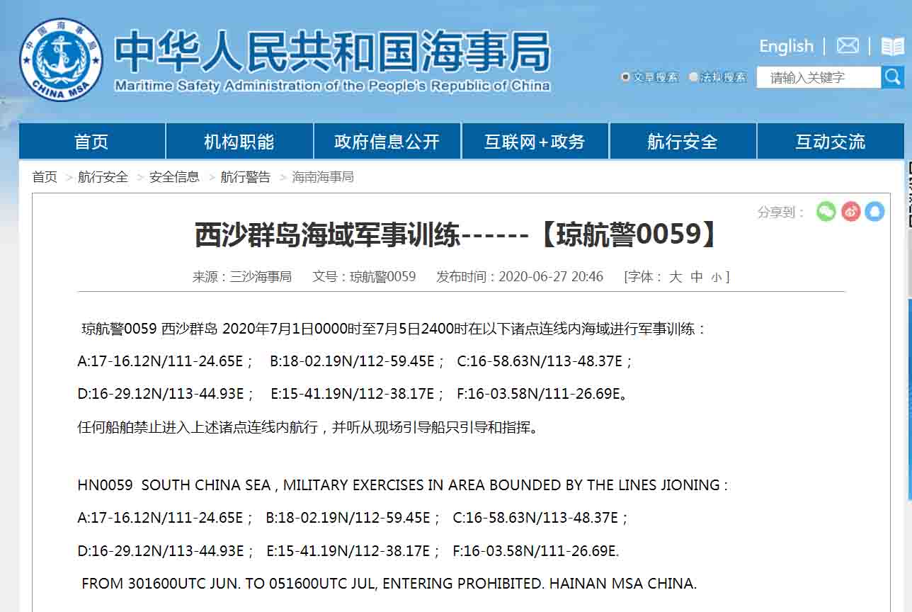 The No. 0059 Navigation Notice ‘Military Exercise in Waters Around The Xisha Islands’ reads that there will be military training exercises in the waters off the Xisha Islands from 0000 hours on July 1st to 2400 hours on July 5th Beijing time. During the period, no vessel shall be allowed to navigate within the above lines and all vessels have to follow the guidance of the commanding ship on site.