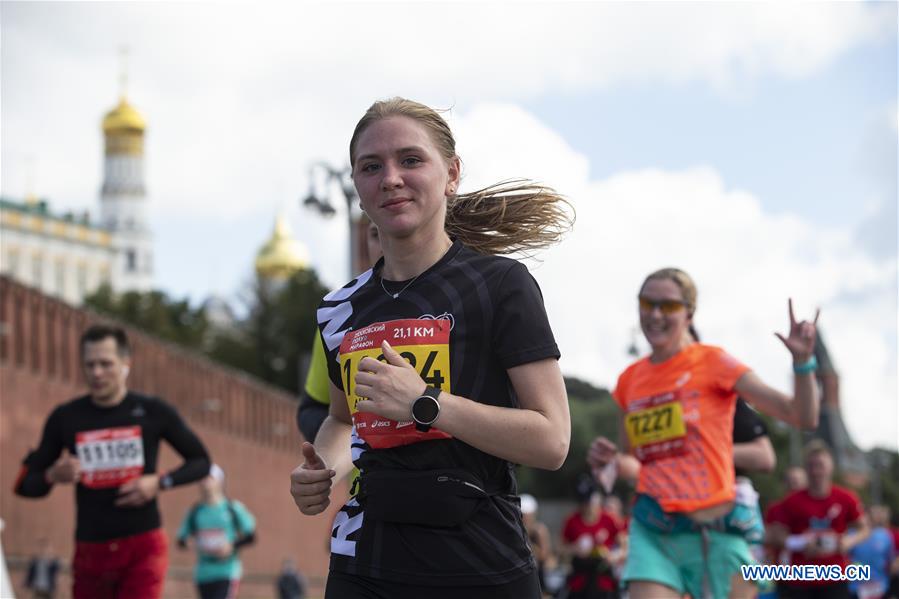 Runners compete during the Moscow Half Marathon in Moscow, Russia on Aug. 2, 2020. (Photo by Alexander Zemlianichenko Jr/Xinhua)