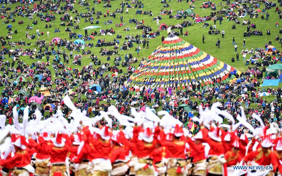People watch performance during the opening ceremony of the 20th Shambhala Tourism Festival in Gannan Tibetan Autonomous Prefecture, northwest China's Gansu Province, Aug. 31, 2020. The 20th Shambhala Tourism Festival kicked off at Dangzhou Grassland here on Monday. (Xinhua/Chen Bin)