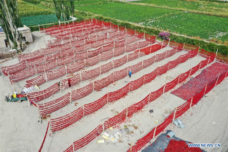 Aerial photo taken on Sept. 1, 2020 shows farmers airing chilies at a village of Bohu County in Mongolian Autonomous Prefecture of Bayingolin, northwest China's Xinjiang Uygur Autonomous Region. More than 500,000 mu (about 33,333 hectares) of chilies in Bayingolin are now entering harvest season. In recent years, local authorities have encouraged local farmers to plant high-quality and high-yield chili varieties based on market needs, as a way to help improve their incomes. (Xinhua/Ding Lei)