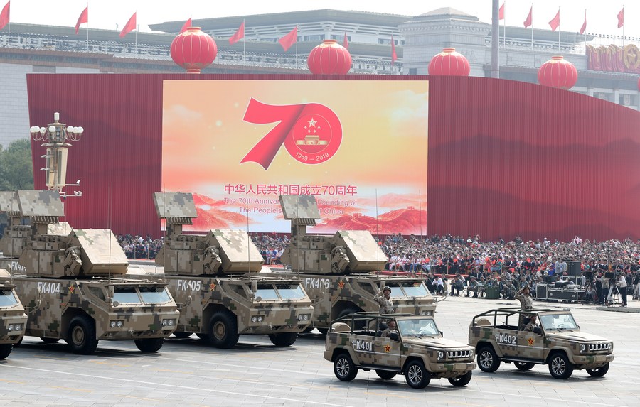 A formation of air defense missiles takes part in a grand military parade celebrating the 70th anniversary of the founding of the People's Republic of China in Beijing, capital of China, Oct. 1, 2019. (Xinhua/Yin Gang)