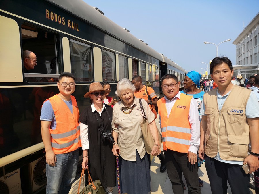 Staff of China Railway 20 Bureau who constructed the Benguela Railway pose for a group photo with visitors from Rovos Rail, in Lobito, Angola, July 30, 2019.(Xinhua/Liu Zhi)