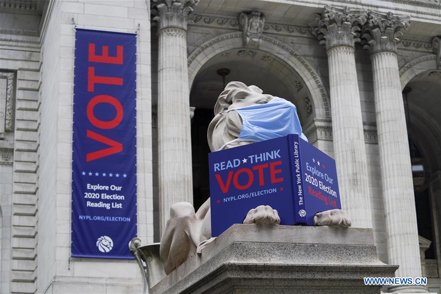 Advertisements encouraging people to vote in the upcoming 2020 U.S. presidential election are seen outside New York Public Library in New York, the United States, Nov. 2, 2020. (Xinhua/Wang Ying)