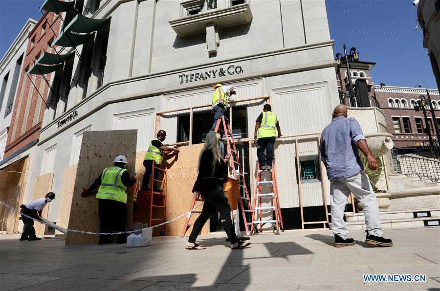 Windows and doors are boarded up in preparation for possible election-related protest or looting in Beverly Hills, Los Angeles County, the United States, Nov. 2, 2020. Election Day voting kicked off in the United States early Tuesday morning with first ballots cast in the northeastern state of New Hampshire. (Xinhua)
