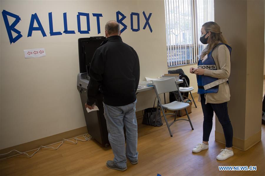 A voter casts his ballot at a polling station in Washington, D.C., the United States, on Nov. 3, 2020. Voting on Election Day is underway across the United States, as the COVID-19 pandemic is raging on and political divide running deeper. (Xinhua/Liu Jie)