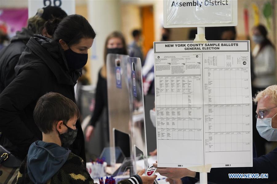 A ballot sample is seen at a polling station in New York, the United States, on Nov. 3, 2020. Voting on Election Day is underway across the United States, as the COVID-19 pandemic is raging on and political divide running deeper. (Xinhua/Wang Ying)