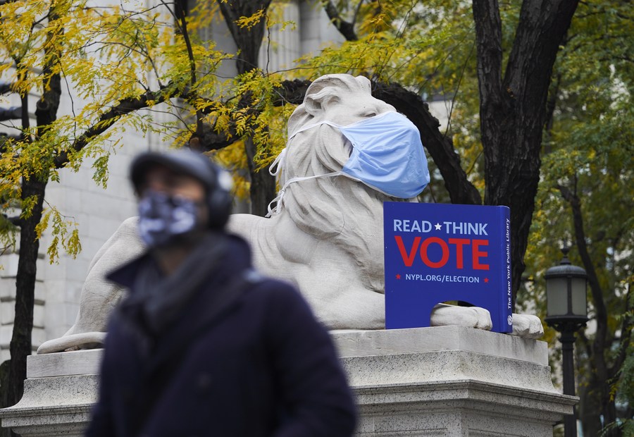 A pedestrian walks past an advertisement encouraging people to vote in the upcoming 2020 U.S. presidential election outside New York Public Library in New York, the United States, Nov. 2, 2020. (Xinhua/Wang Ying)