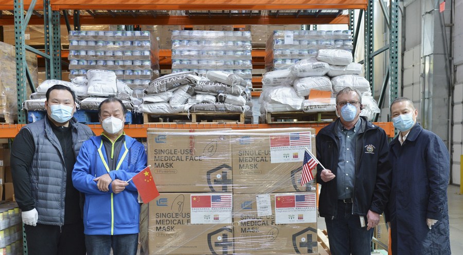 Photo taken on April 27, 2020 shows people posing for a photo with the face masks donated by China's Fujian Province in Oregon, the United States. (Xinhua)