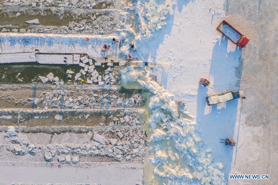 Aerial photo taken on Dec. 19, 2020 shows workers collecting ice cubes on the frozen Songhua River in Harbin, northeast China's Heilongjiang Province. Harbin, dubbed China's "ice city", attracts tourists by making the best use of ice element during the winter time. (Xinhua/Xie Jianfei)