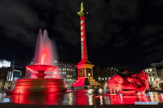 Photo taken on Feb. 10, 2021 shows the Nelson's Column and fountains illuminated in red to celebrate the forthcoming Chinese Lunar New Year, the Year of the Ox, at Trafalgar Square in London, Britain. (Xinhua/Han Yan)