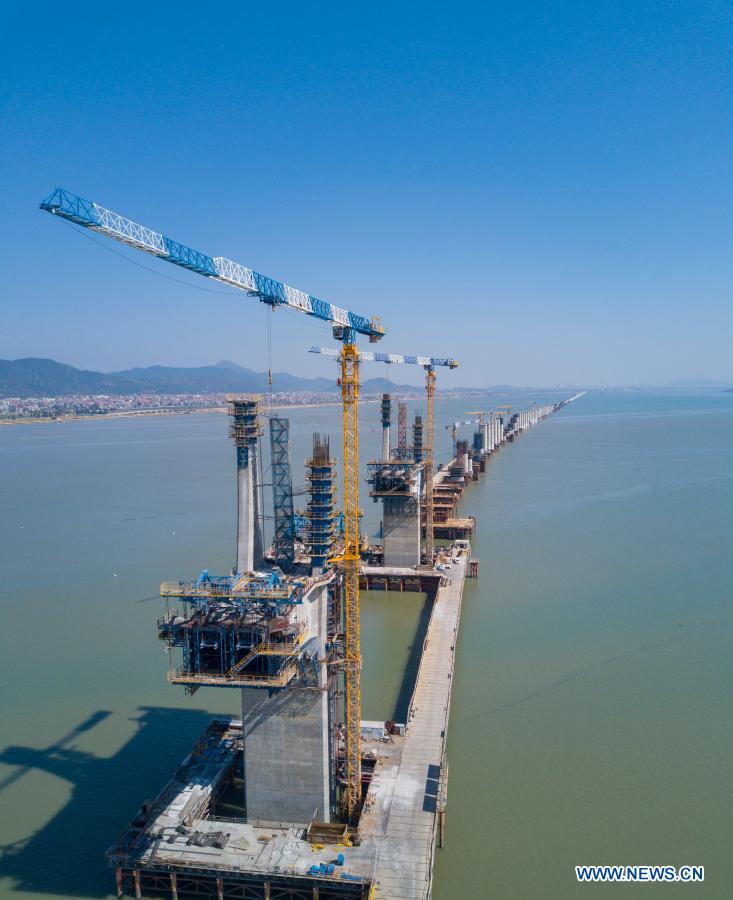 Aerial photo taken on Feb. 15, 2021 shows the construction site of Meizhou Bay cross-sea bridge of the Fuzhou-Xiamen high-speed railway in southeast China's Fujian Province. Some 500 laborers still work at the construction site of the bridge during the Chinese Lunar New Year. The 14.7-km-long bridge is part of the province's Fuzhou-Xiamen high-speed railway, the first cross-sea high-speed railway in China, which is expected to be put into operation in 2022. (Xinhua/Song Weiwei)