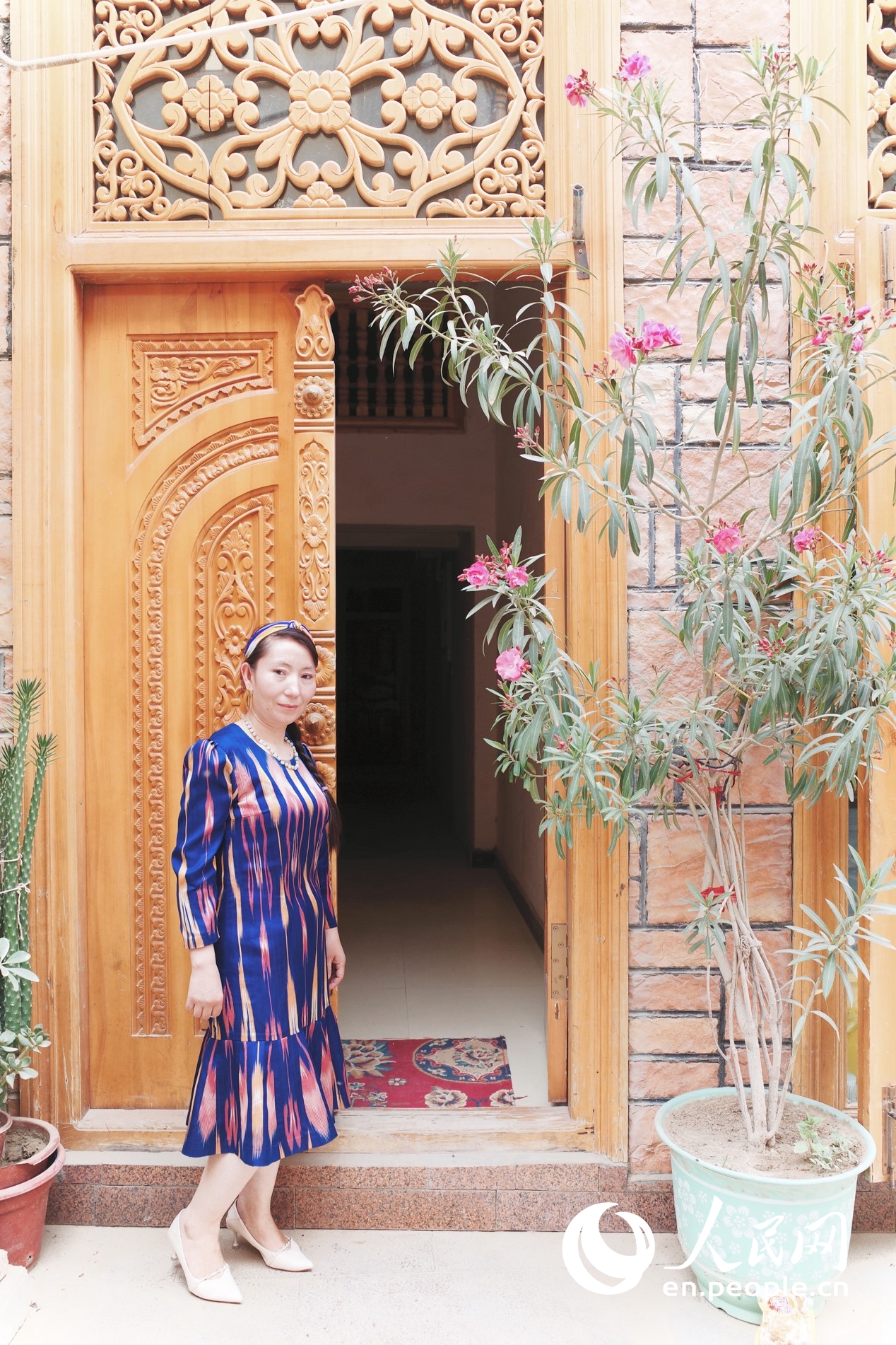 Tunsahan stands outside her new residence in Hotan, northwest China's Xinjiang Uygur Autonomous Region. (People's Daily Online/Kou Jie)