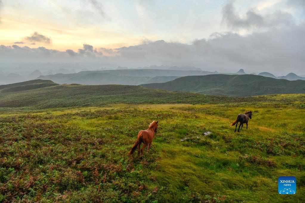 A sunrise view is seen at a scenic spot in Hezhang County, southwest China's Guizhou Province, Sept. 4, 2021. Hezhang County, featuring beautiful natural scenery and distinctive culture, has ramped up efforts in improving tourism facilities and boosting tourism industry in recent years. Tourism development of the county has given impetus to its rural revitalization. Statistics show that the county has received 4.34 million visitor trips from January to August this year. (Xinhua/Yang Wenbin)